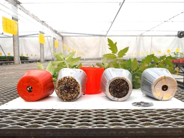 グローブロックは、ココピートを生分解フイルムの不織布で包んで使用しており、植物残渣と分けることなく処分出来ますが、グローブロック培地自体の価格が2重ポットより高価なこと、また2重ポットではスルーホールポットだけでは培土の充填、鉢上げなどの作業で培土が抜け落ちてしまい、育苗期間中にはどうしてもポットを重ねて管理する必要があり、お客様が定植時に外側のポットを取り外しそのまま廃棄、残渣処分の際に分別しないといけない手間など一長一短です。