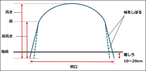 トンネルパイプを地面に挿しこみ、ビニールを張るだけでトンネル栽培ができます。日中は太陽の熱でトンネル内の温度が上がり、発育初期に必要な温度を保つことができます。