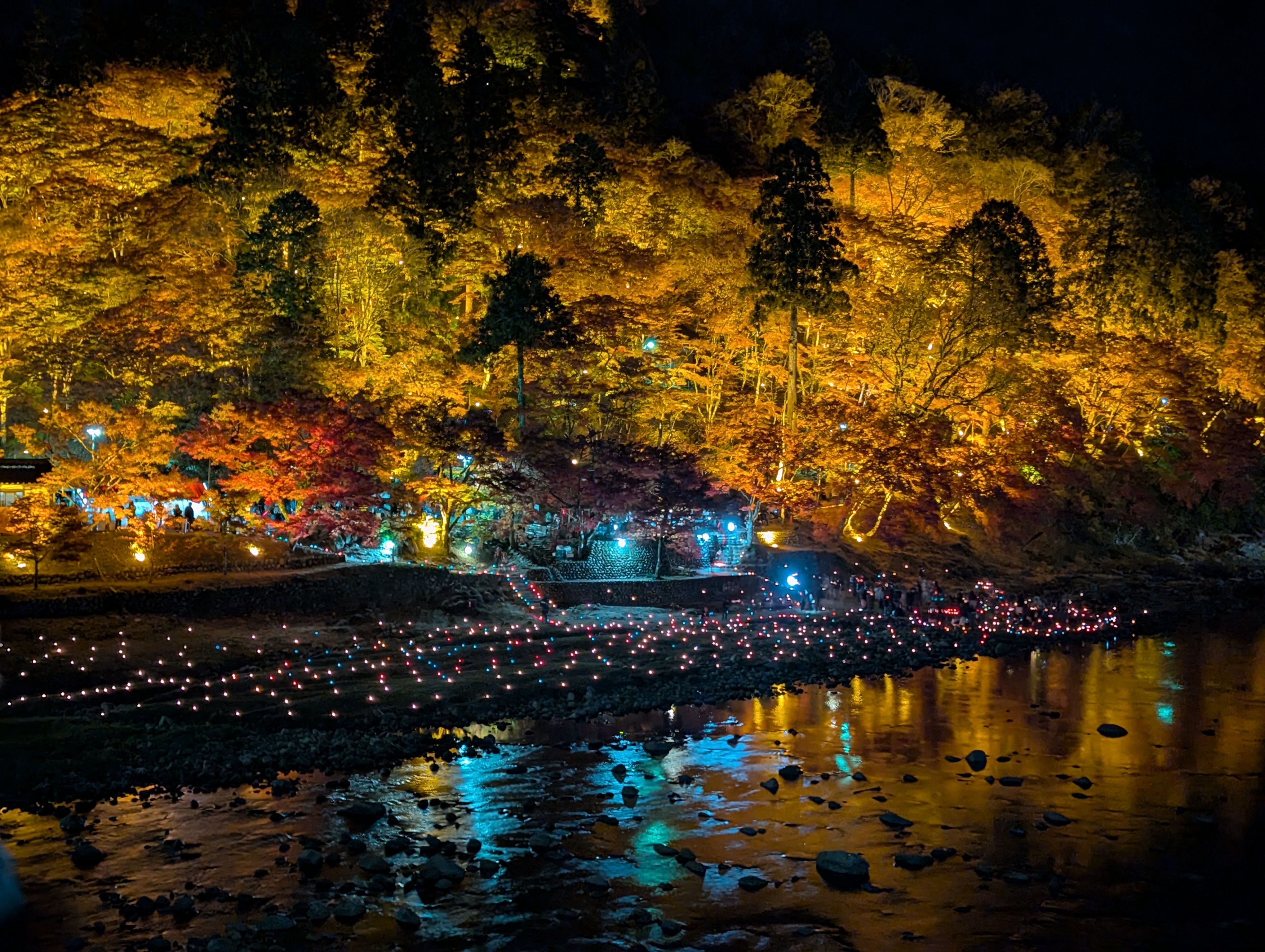 この写真は、11月23日に撮ったもので、ちょうど見ごろで綺麗な紅葉を楽しめました。また、紅葉の時期に合わせて、「香嵐渓もみじまつり」というものを開催されていました。当日、香嵐渓では、猿回しやライトアップや竹灯りで照らされた香積寺が見られました。今年、香嵐渓の紅葉を見に行った方はいらっしゃいますか。 “まだ一度も行ったことが無い”という方は、ぜひ来年お越しになってください。