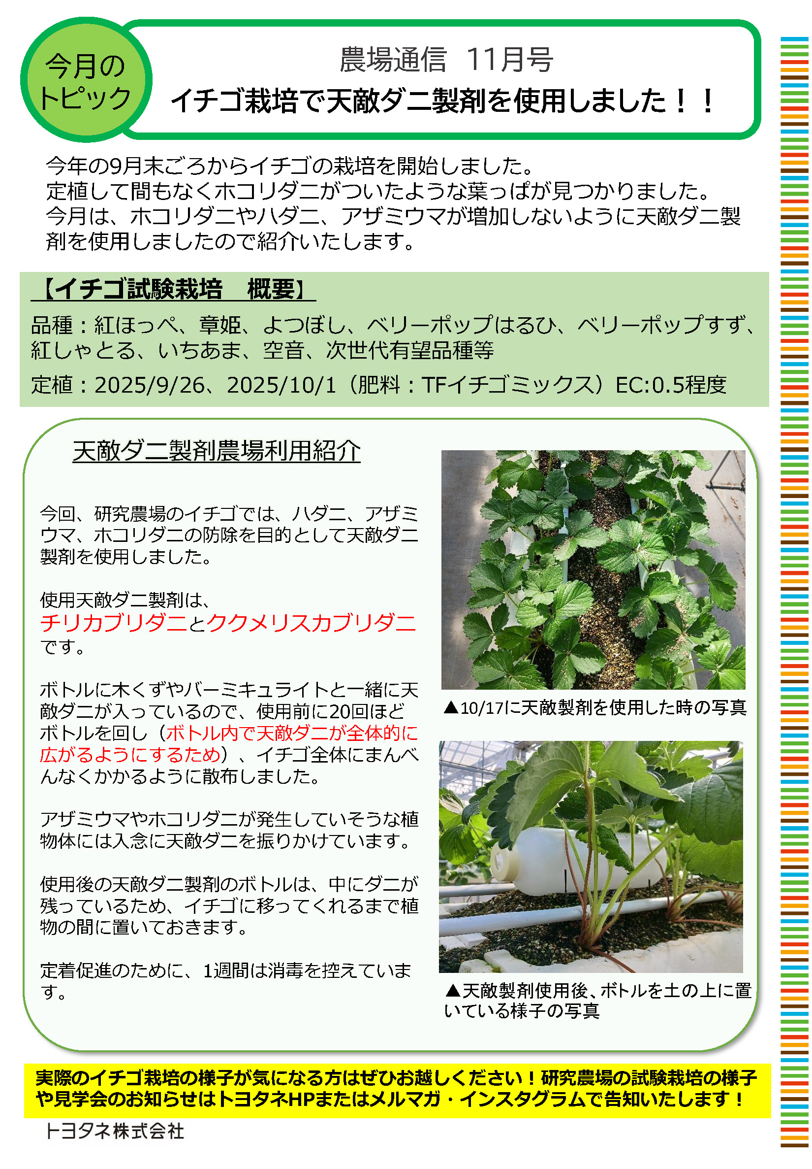 ・ 今月は「イチゴ栽培で天敵ダニ製剤を使用しました!!」です。