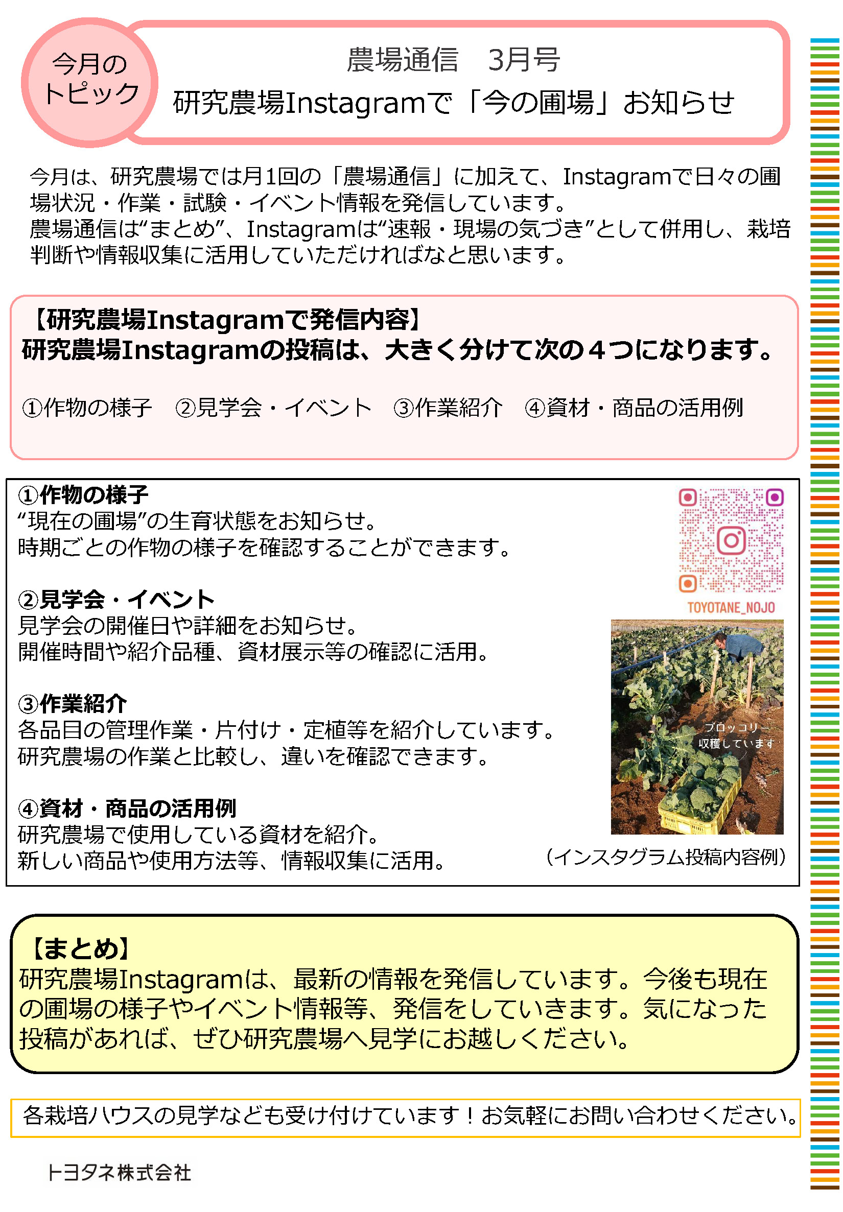 ・今月は「研究農場Instagramで「今の圃場」お知らせ」です。