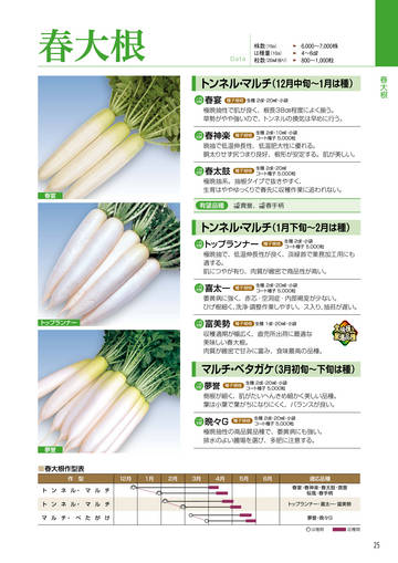 お客様各位に置かれま してはますますご健勝のこ と とお慶び申 し上げます。 また日頃のご愛顧に厚く 感謝、御礼申し上げます。 本年度も常態化しつつある「異常気象」に多くの農家は大変苦労さ れているこ と と思います。TPP交渉も ま と ま る よ う に見えて、再び暗礁に乗り 上げま した。 アベノ ミ クス農業成長戦略においては「新たな市場の創出〜農業はよ り 大規模に ! よ り 自由に !〜」 と掲げられています。 担い手への農地集約、 コス ト 競争力のある大規模農家の育成が大き な政策課題になっている よ う です。 しかし農地の集約によ る大規模化は言葉で言う ほど簡単ではあ り ません。 弊社でもなかなかお手伝いでき ません。その代わり に弊社では今ある農地 の生産性向上に少しでも役立つよ う な商品・情報の提供を使命と して取り 組んで参り ます。 またも う一つの視点と して、 「春作」 農業の充実があり ます。かつて当 地方で盛んだったメロンやスイカ、ニンジン等の栽培は減り続けています。 また施設においては トマ トや菊に代表される 1品目の周年栽培が主流となっ ています。いわゆる「春作」と呼ばれる園芸農業の守備範囲はどんどん 狭く なっています。弊社と しては「春作でも儲かる ! 」 農業の提案が少しで もできればと取り組んで参り ます。本カ タログがその一助と なれば幸いです。 今後も ますますのご指導、ご鞭撻を宜し く お願い申し上げます。