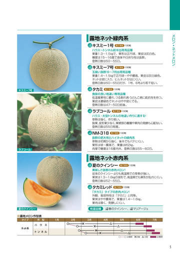 果皮が灰白色で高品質な夏系品種。 草勢は強め、節間が短く葉は小葉で立性。 雌花の着生及び着果は良好。 果形はやや縦長、 果肉は黄緑色で糖度の上りが良く、 食味が非常に良い。 5. 交配後、7月中旬収穫なら55日、8月上旬収穫な ら53日前後で収穫となる。 6. つる割病(レース0、 2)に抵抗性、うどんこ病に 耐病性を持つ。