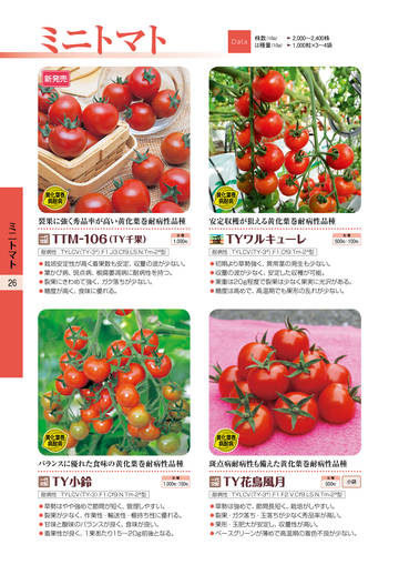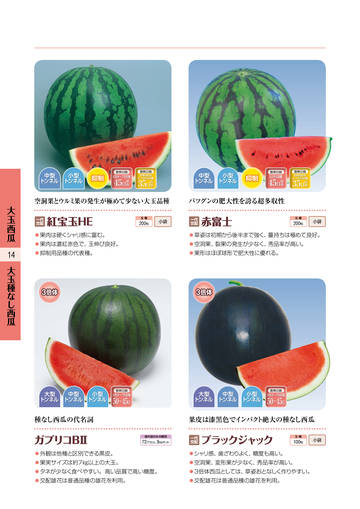 アールスメロン ……………………… 02 地這系メロン ………………………… 08 メロン用台木 ………………………… 11 西瓜 …………………………………… 12 西瓜用台木 ………………………… 17 スイー トコーン ……………………… 18 大玉トマ ト …………………………… 24 ミニ トマ ト ……………………………… 26 茄子 …………………………………… 30 ピーマン/とうがらし ……………… 31 南瓜 …………………………………… 32