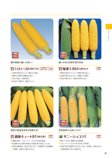 • 熟期は84日タイプの早生イエロー種。 トンネル栽培からマルチ栽培まで適応幅が広い。 • 雌穂はシリンダー型で揃い良く、 収量性が高い。 • 食味が良く、 非常に萎びにくく収穫適期幅が広い。 • 倒伏や紋枯病に強く、 栽培しやすい。