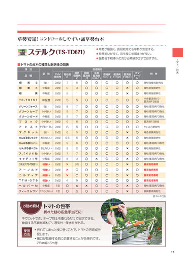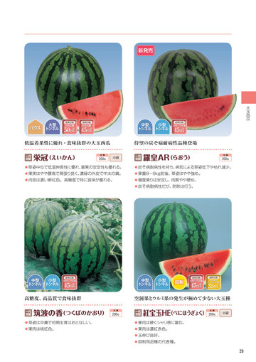 スイー トコーン ……………………… 02 大玉トマ ト …………………………… 10 ミニ トマ ト ……………………………… 14 アールスメロン ……………………… 18 地這系メロン ………………………… 24 メロン用台木 ………………………… 27 西瓜 …………………………………… 28 西瓜用台木 ………………………… 33 茄子 …………………………………… 34 ピーマン/とうがらし ……………… 35 南瓜 …………………………………… 36 ズッキーニ …………………………… 37