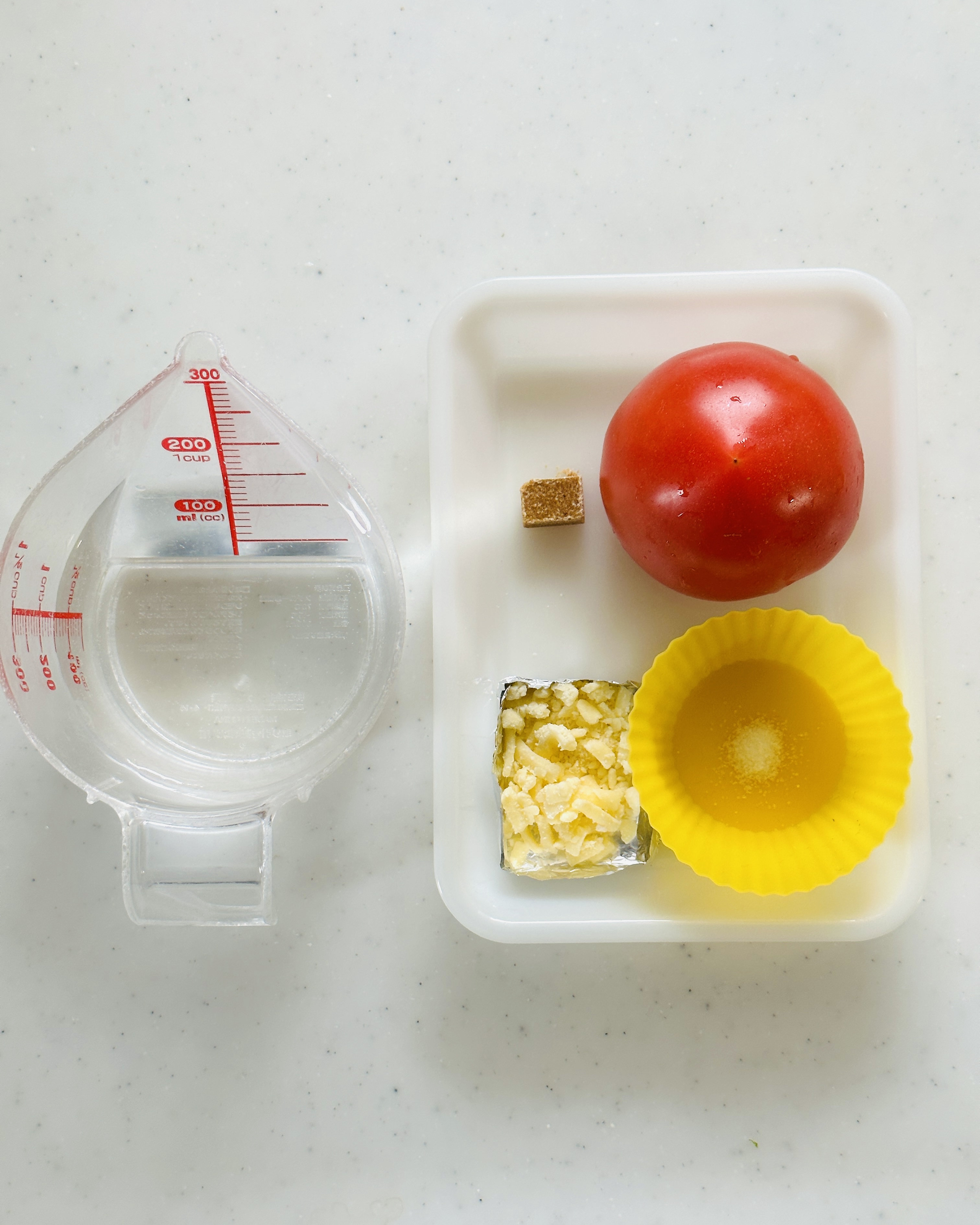 A)トマト 中1個 A)コンソメ 1/2個 A)塩ひとつまみ A)水 150ml ピザ用チーズ 6g ブラックペッパーお好みで