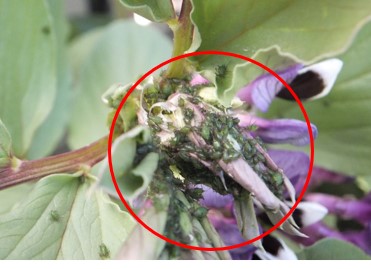 ◎ソラマメの着莢が始まり、茎の先端部分の切り取りをいつ行おうかと、ソラマメを観察したところ、以前とは違う茎の先端部分にアブラムシを確認しました。