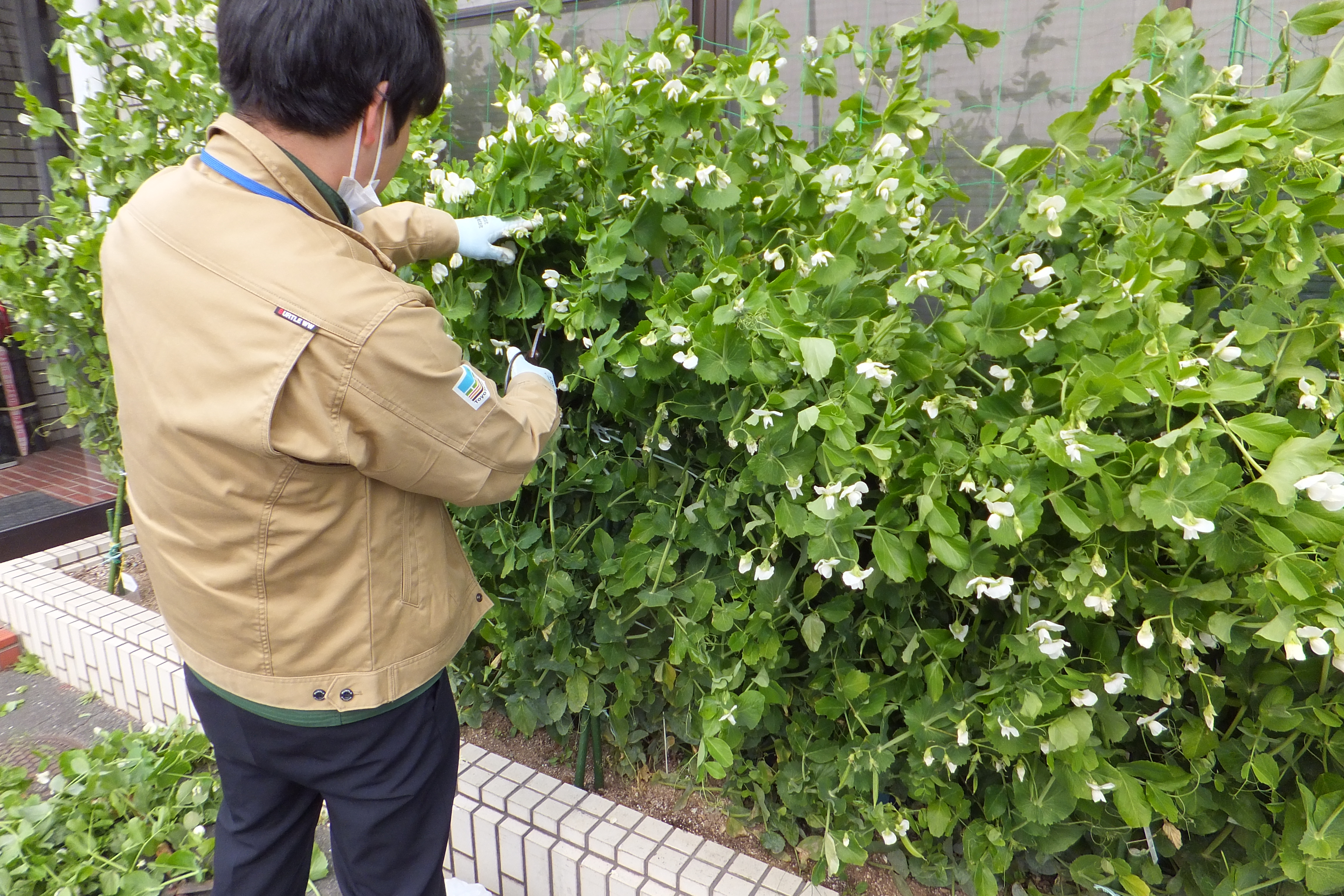 先端を切り取ることで、下部に着莢した実が充実するとともに養分が行き届き、実入りが良くなります。