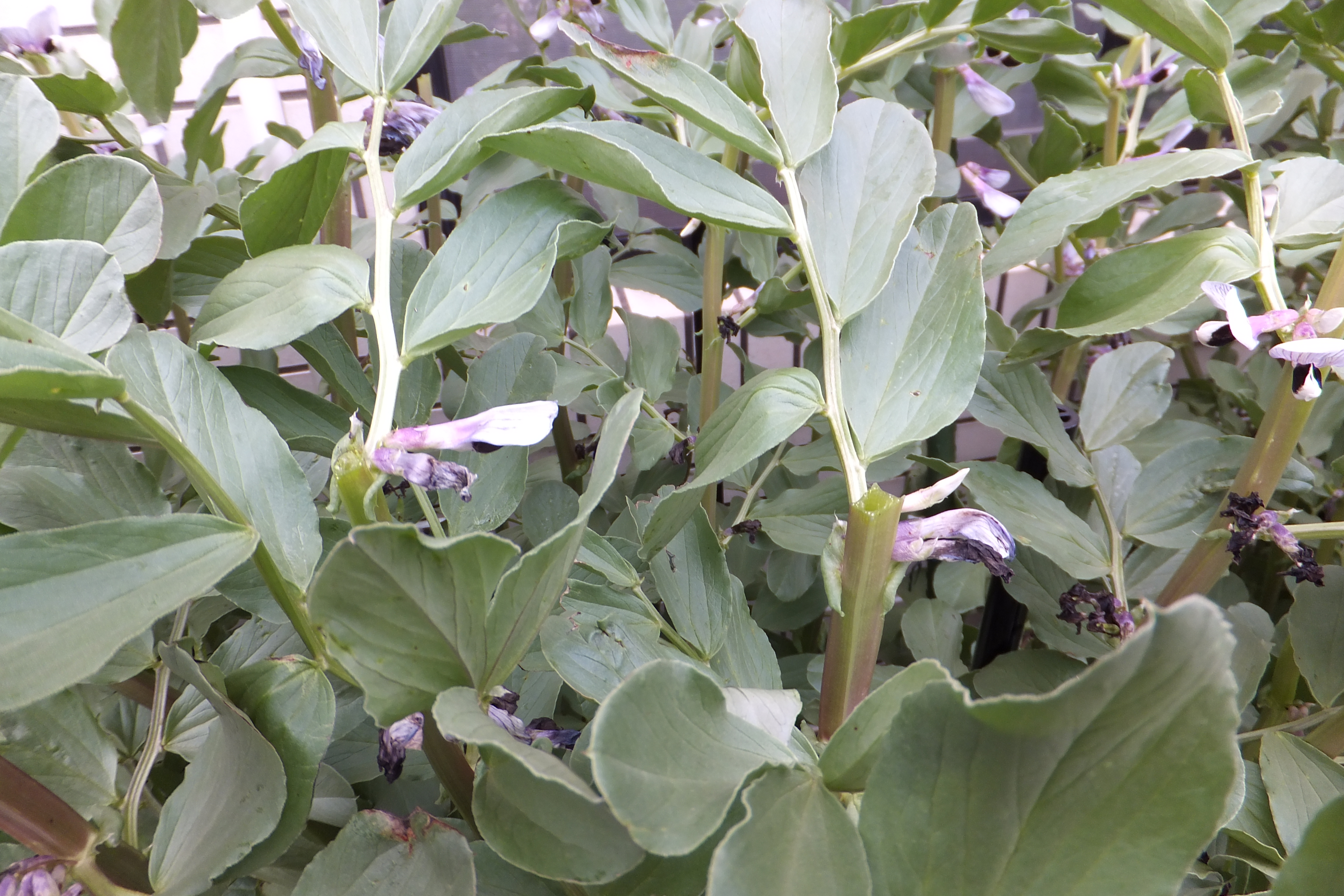 しかし、ソラマメの莢は下のほうから数えて数節のものが着莢するだけで、その上方の莢は下のほうの莢に栄養を奪われたり、温度が高くなり過ぎたりするために、着莢しないのが普通です。