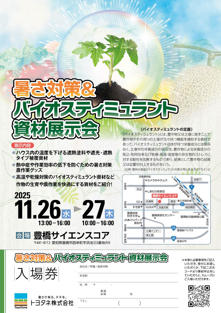 今回は「暑さ対策&バイオスティミュラント資材展示会」と銘打って、近年ますます深刻化する高温環境への対応と、作物の健全な生育を促進するバイオスティミュラント資材に注目!