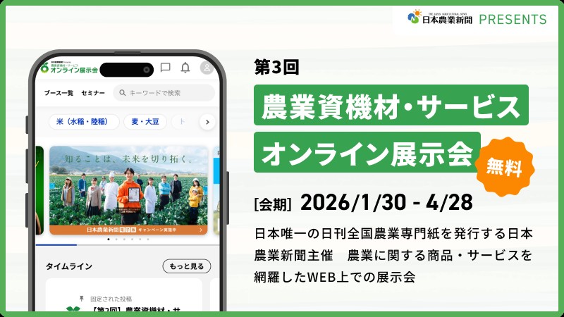この度、弊社は日本農業新聞社主催「第3回農業資機材・サービス オンライン展示会」に出展する運びとなりました。