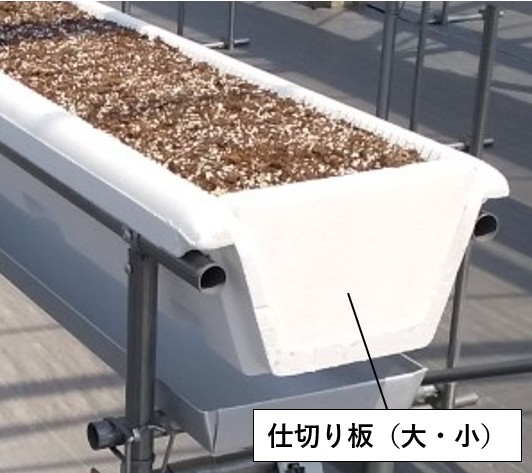 この高設栽培は地面から隔離され、培地は肥料分が含まれていないヤシガラや培養土を使用。この養液で水と肥料成分を供給。