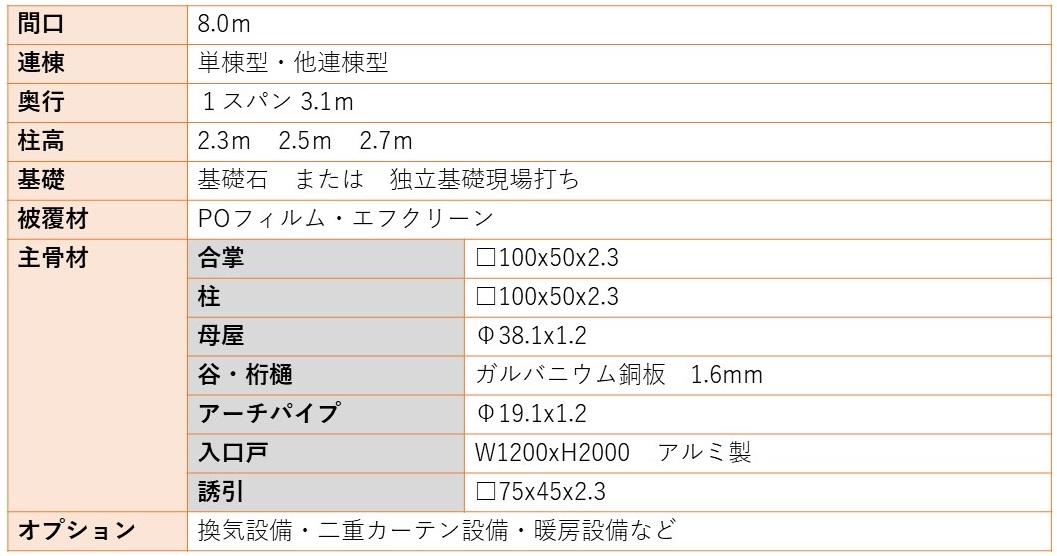 2.5mの柱高で、立体的な栽培を行うことができます。採光性が良く、ハウス内へ光を取り入れます。また、カーテンや暖房機、循環扇など様々な設備が取付可能で、高度な栽培を実現することができるハウスです。