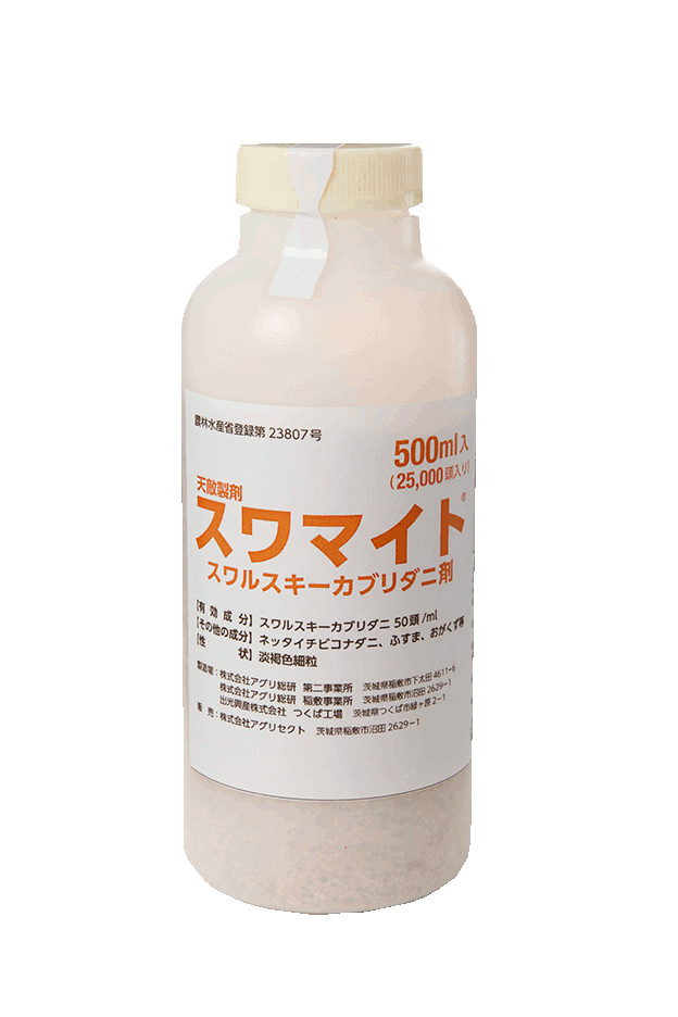 ミッチトップは、ハダニ類の捕食性天敵であるミヤコカブリダニおよびチリカブリダニをボトルに封入した製剤です。