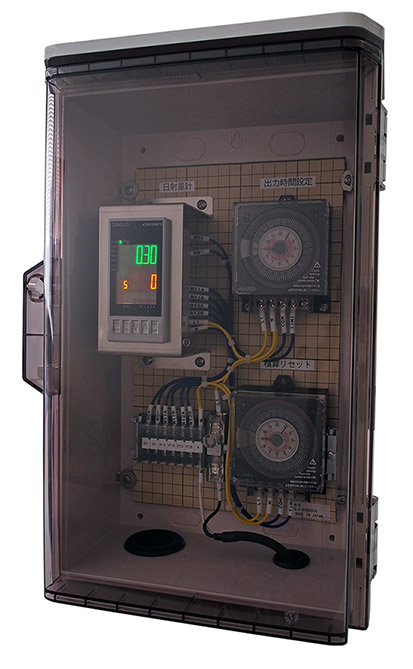 『だんぼう当盤』はハウス内の温度と湿度を計測し、ハウス内の温度・湿度環境を制御する暖房機用コントローラです。本体とセンサーボックスから構成されます。